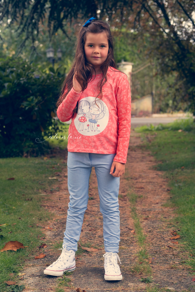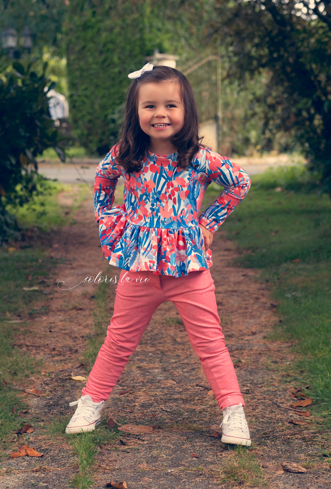 Pour Victoria, j’ai cousu un benoit en French Terry corail associé à un top Roseline en french terry floral. En complément elle porte une petite veste Violette en softshell floral C’est une tenue idéale pour sa première rentrée des classes!