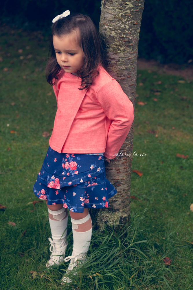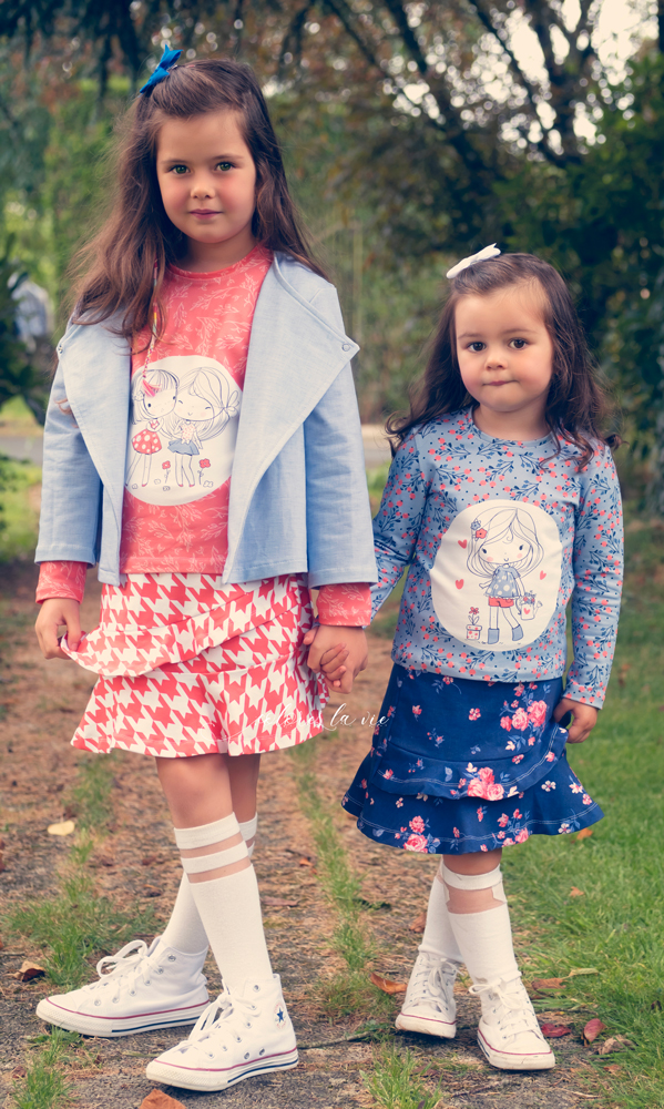 Une jupette Nina en pied de coq pour Elena, un motif au look vintage que j’adore! Elle est associée à un petit Annabel avec le panneau et une petite Veste Jacqueline avec l‘uni Effet lin.Victoria porte elle aussi la Veste Jacqueline et la jupe Nina en French Terry et enfin Elena porte son Benoit pour un autre look plus décontracté!