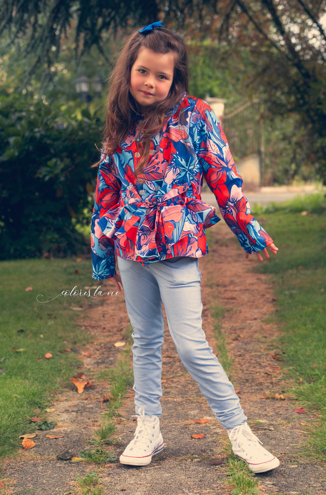 J’ai utilisé de l’imperméable hibiscus pour la veste Nicole pour Eléna. Je voulais lui en coudre une nouvelle depuis longtemps, le tropical hibiscus sur lequel elle a flashé était une bonne opportunité! La veste est associée au tregging benoit avec le French Terry effet lin bleu .